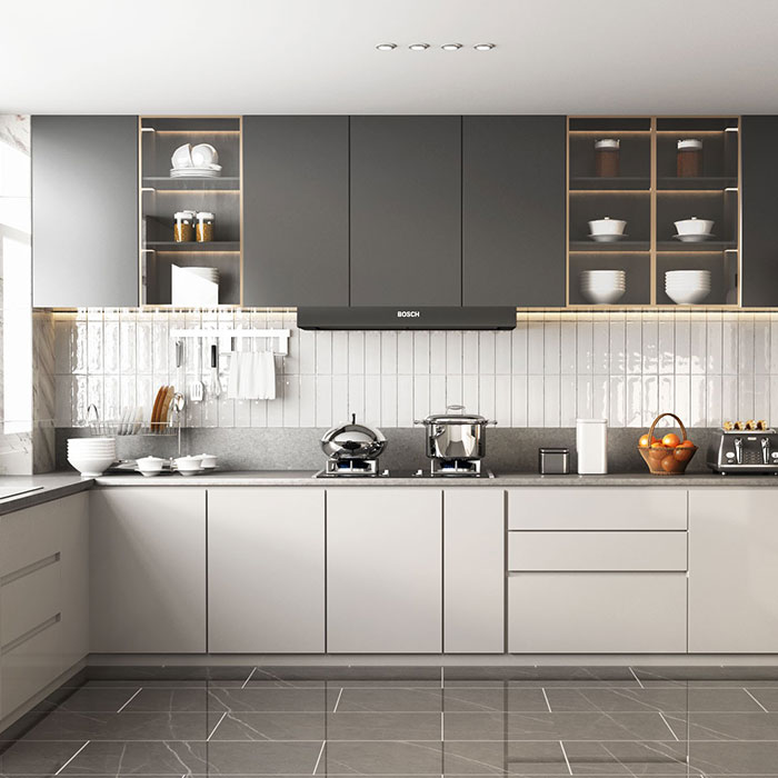 We take a large area of creamy white as the main tone, which not only brightens the entire kitchen space, making it look spacious and bright, but also brings a pure and fresh atmosphere, relieving the fatigue of cooking. The thoughtful use of black and solid wood as decorative accents adds layers to the space: black hardware (such as handles, faucets) and solid wood cabinets or countertop edges create a classic color contrast, which not only enriches the visual effect but also enhances the high-end texture of the whole kitchen.