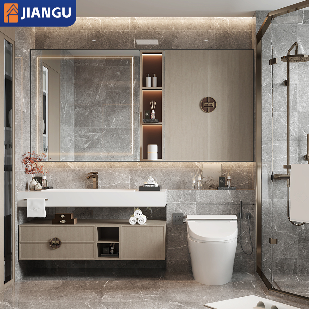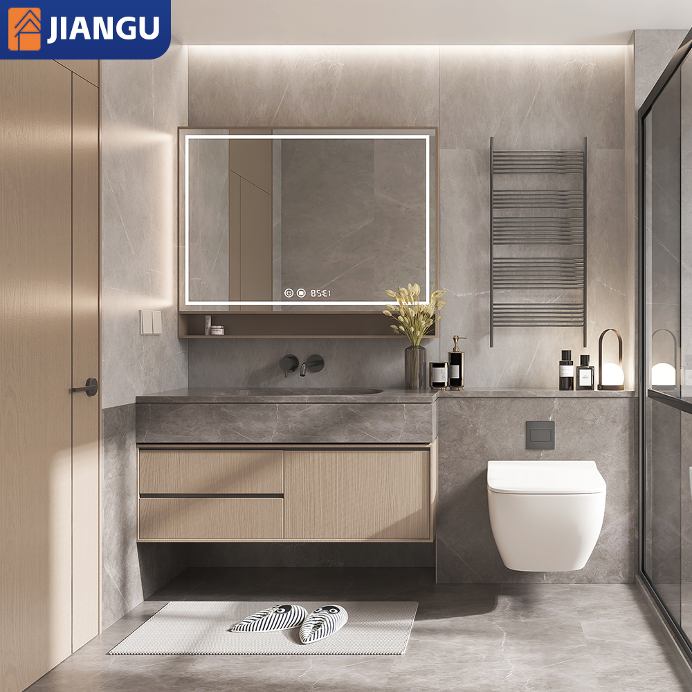 Luxury Modern Wall Mount Floating Bathroom Vanity Cabinet Wash Basin Modular Bathroom Furniture with Round Mirror and Sink