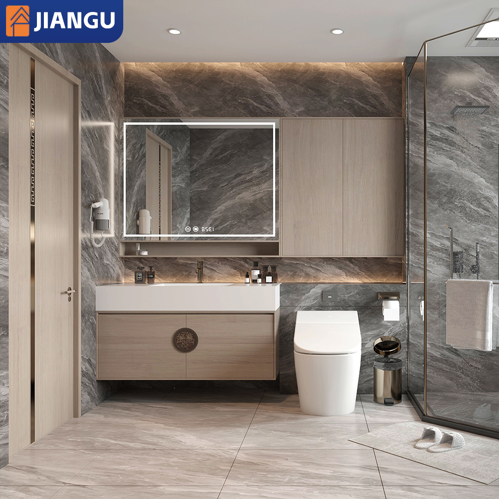 Customized Shower Wooden Wall Mounted Space Saver Vanity Plywood Bathroom Cabinet with Slab Basin Led Light Mirror