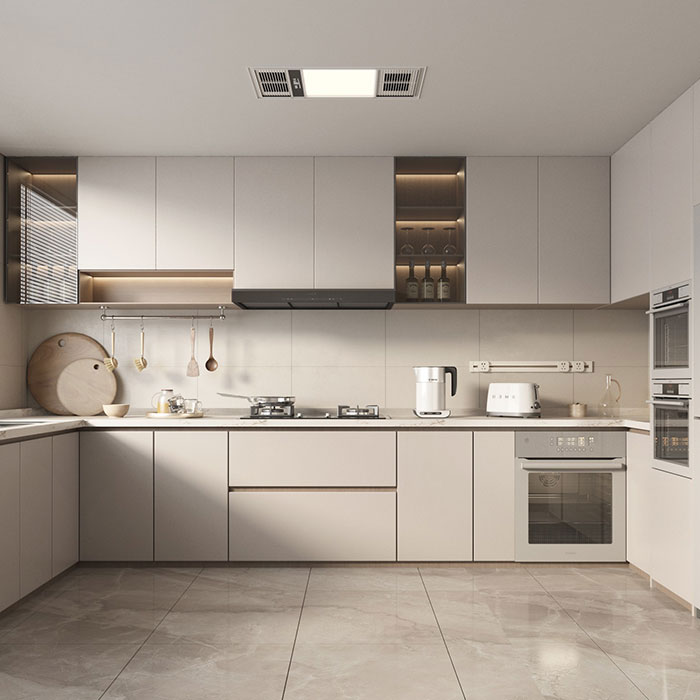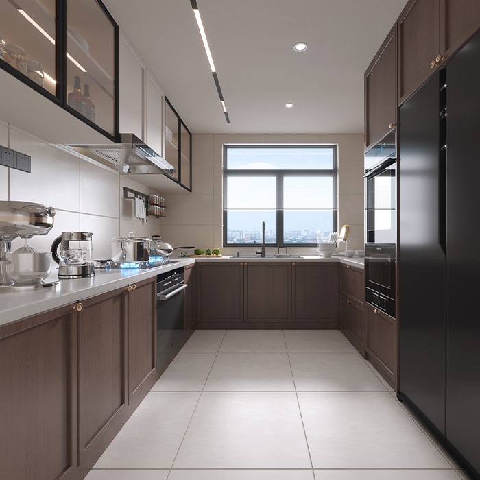 We take a large area of creamy white as the main tone, which not only brightens the entire kitchen space, making it look spacious and bright, but also brings a pure and fresh atmosphere, relieving the fatigue of cooking. The thoughtful use of black and solid wood as decorative accents adds layers to the space: black hardware (such as handles, faucets) and solid wood cabinets or countertop edges create a classic color contrast, which not only enriches the visual effect but also enhances the high-end texture of the whole kitchen.